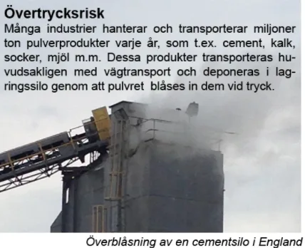 Denna pneumatiska transport använder tryckluft för att transportera produkten till silon, vilket skapar en extremt allvarlig övertrycksrisk om luftflödet inte kontrolleras eller om luften inte ventileras effektivt genom ett filter. De flesta silor är inte tryckkärl, och det krävs endast en liten ökning av det inre trycket (så lite som 1 psi) för att antingen spränga silon eller blåsa filterenheten från taket.